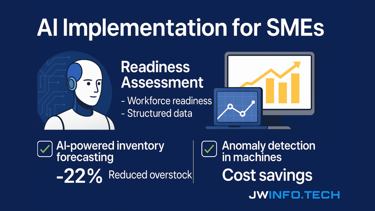 JW Infotech approaches AI adoption through a strategic, assessment-led framework that helps SMEs first evaluate where they are β before building what they need.